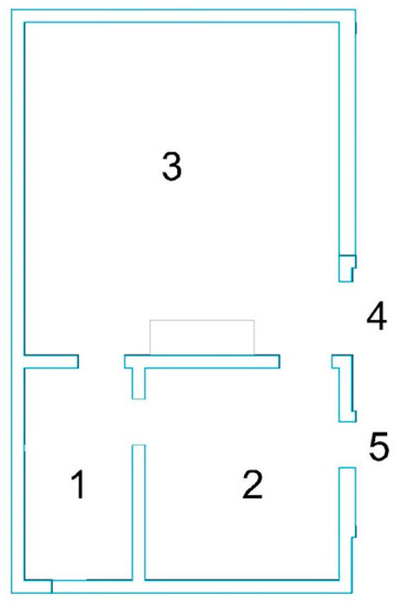 Layout of Architecture. The whole space was divided into three halls, namely 1, 2, and 3. There were entrances and exits between the spaces. The space exits were node 4 and node 5.
