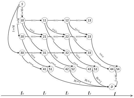 Let , then is the utility of the pedestrian evacuation time selection. The evacuation decision probability of pedestrian i in the t-th decision-making period can be expressed as Equation (4).