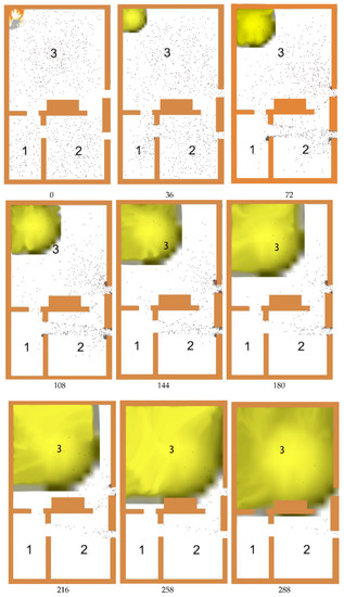 The timing of the fire was controlled by a fire alarm button inserted in the model. When the fire alarm button was clicked, a fire occurred, and the personnel in the model selected the basic assumptions of the model and the case to evacuate according to the previous evacuation time. The evacuation process is shown in Figure 3. The spread of fire smoke was simulated through the system dynamics model, and the diffusion rate of smoke was set to 0.3 m/s. The yellow area in Figure 4 represents the gradual diffusion of smoke caused by fire.
