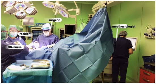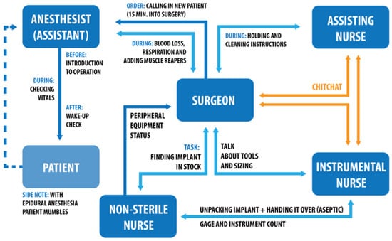 The team is divided into sub-teams: The ‘sterile’ medical staff is responsible to perform the surgery (e.g., surgeon, operating assistant, and resident). They stay in the sterile or aseptic area (marked on the floor) during the entire surgery. The ‘non-sterile’ medical staff consists of those team members who are located outside the sterile area (e.g., circulating nurses and anaesthesiologists) [99]. They are responsible to take care of the patients’ well-being during the surgery (e.g., anaesthesiologists) and to support the surgical team (e.g., circulating nurse). Some surgeries also require other professions, such as radiologists [100] or other individuals present (e.g., researchers, medical students, etc.).