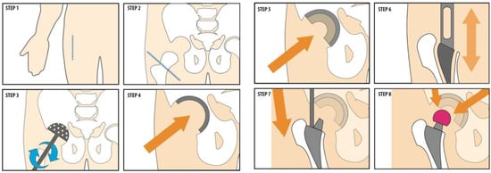 The procedural steps of Total Hip Arthroplasty (THA) Surgery. Step 1. Incision; Step 2. Cutting the Femoral neck; Step 3. Reaming the Acetabular; Step 4. Placement of Acetabular cup; Step 5. Placement of Acetabular cup liner; Step 6. Opening the Femoral canal; Step 7. Placement of Femoral stem; Step 8. Placement of Femoral head. The arrows indicate the force applied by the surgeon with a surgical hammer which as a consequence produces sound.