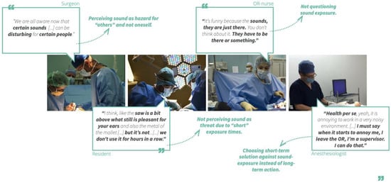 Many opposed using earplugs as they potentially block verbal cues such as commands and auditory cues that are needed for the surgical tasks. It was mentioned that surgeons’ actions may be louder when they use earplugs. Many pause conversations during loud sounds. Anaesthesiologist and anaesthetic assistants indicate that patient monitor alarms may signify a calamity and cannot be missed. Surgical sounds are also considered as communication and many do not wish it to be silenced. Next to sounds surgeons especially use tactile feedback in addition to sound to feel whether the metal cap is well inserted by the mallet’s hammer blow. In Figure 11, we exemplify some key comments of the OR teams within a visual diagram.
