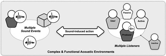 Our exploration will expand the earlier work on sound-centric studies (e.g., psychoacoustics, product sound quality, soundscape perception) that focus on sound being the cause of more generic human experiences (i.e., from perception and cognition to action) and imply that sound or its source can and should be manipulated for improved perceptual and cognitive experiences [5,6,7,8]. This approach has indeed been so far instrumental in engineering and design of products and (eco)systems for improved functionality and acceptability. However, in recent studies, delle Monache [9,10] showed that listening-in-action is the primary and core activity when either using sound for completing a task or designing for human-sound interactions. User-centered approaches emphasize the importance of understanding the context of the user and their needs for better designs (e.g., Sleeswijk Visser and Stappers’s work on context mapping [11]). Similarly, our listener-centric approach for complex functional environments is intended to highlight listeners and advocate that the listening experience is in the ‘ear of the beholder’ and is defined by listener’s goals with the product/service/system.