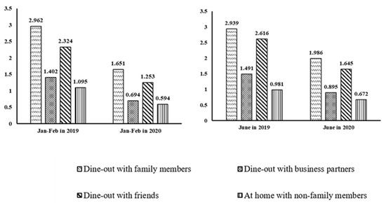 We discuss the changes in meal gathering patterns over time (i.e., 2019 vs. 2020). Figure 1 and Table 2 break down the frequency of four types of meal gatherings over time. Figure 1 reports the sample mean of meal gatherings with different types during the two periods. Figure 1 shows that the number of meal gatherings during the outbreak period are all less than the same period in the previous year (i.e., each column represents a different type in Figure 1). This declining trend was supported by the results in Table 2 (Panel A). Especially for the January to February period, compared with 2019, the number of meal gatherings affected by the pandemic on all occasions dropped by at least 44.26%. The number of away from home meal gatherings with family members decreased the most in magnitude by 1.311 meals but at the lowest percentage change (44.26%); the largest percentage decrease occurred for gatherings away from home with business partners with a 50.5% drop. The number of at home meal gatherings with non-family members dropped the smallest in magnitude by 0.501 compared to 2019.