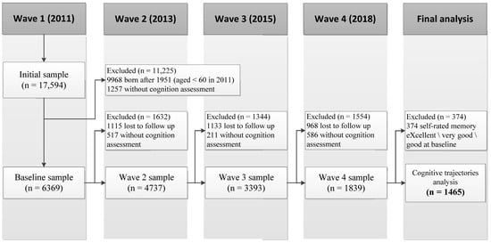 Our study used data from four waves of the China Health and Retirement Longitudinal Study (CHARLS, 2011–2018). CHARLS is a publicly accessible database created by the National School of Development at Peking University. Further details can be found on the official website (http://charls.pku.edu.cn, accessed on 12 March 2022). The CHARLS was a large, nationally representative cohort study that focused on participants aged 45+ years, which included information regarding their social, economic, family, activity, and personal health conditions. The survey was launched in 2011 and followed up in 2013, 2015, and 2018. The sample was randomly selected from 150 counties or districts, with 450 communities or villages distributed across 28 provinces. The biomedical ethics committee approved this program (IRB00001052-11015), and all participants provided informed consent. All participants were interviewed face-to-face by trained professional researchers using structured questionnaires. Detailed sampling methods were described in Zhao et al. [24]. Figure 1 shows a flowchart of the sample selection process.