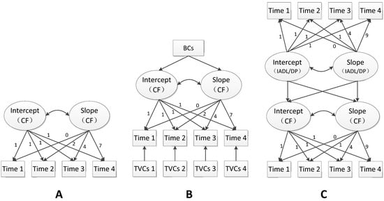 Hypothesized latent growth curve model (LGCM) of this study. CF: Cognitive Function, including Global Cognition and 5 dimensions (Orientation, Episodic Memory, Calculation, Constructability); BCs: Baseline Covariates, including age, gender, education, marriage, napping time, night sleeping time, the number of cardiovascular and cerebrovascular diseases, drinking, smoking, instrumental activities of daily living (IADL), and depression (DP); TVCs: Time-Varying Covariates, including marriage, napping time, night sleeping time, the number of chronic diseases, IADL, and depression (DP) across 4 waves. Model (A) Univariate LGCM, to investigate the trajectories of CF across 4 waves. Model (B) Conditional LGCM, to investigate the trajectories of CF and its association with BCs and TVCs. Model (C) Unconditional Parallel Process LGCM (PP-LGCM), to investigate the relationship between CF, IADL, and DP across 4 waves. (The data were collected at 2011, 2013, 2015, and 2018, which accounted for the time coefficients of 0, 2, 4, and 7 in model (A) and model (B). Since the trends of IADL and depression showed curvilinear changes, the quadratic curve growth patterns were explored with time coefficients of 0, 1, 4, and 9 in model (C)).