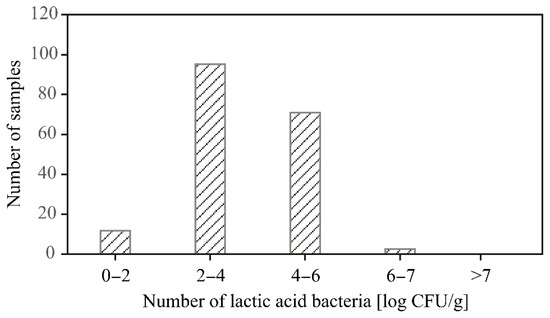 Additionally, Figure 1 indicates that the most frequent ranges of LAB concentration were 2–4 log CFU/g and 4–6 log CFU/g, while ranges of 0–2 and 6–7 log CFU/g were spotted in the case of several samples annually. The scientific literature emphasizes that the number of LAB above 7 log CFU/g leads to the development of spoilage and results in meat unacceptability [46], wherefore the obtained results in this study are propitious. On the other hand, the presence of LAB can have a positive effect on the meat. Namely, metabolic activities and produced metabolites can have an inhibitory effect on food spoilage and pathogenic bacteria such as E. coli and S. aureus [46].