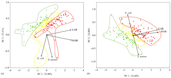 PCA ordination of variables based on component correlations: (a) projection in PC1-PC2 plane, (b) projection in PC1-PC3 plane for mesophilic and aerobic bacteria (MAB), E. coli, lactic acid bacteria (LAB), and S. aureus.