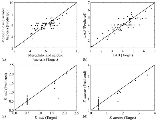 Many empirical models are used for understanding microbiological profiles of meat and meat products, but a step forward in advanced mathematical and statistical modelling is still not widely applied. Only a few studies included using predictive tools for an explanation of microbiological experimental data, such as partial least squares regression analysis [47], growth kinetics modelling [48,49], nonlinear least square regression analysis with the Levenberg–Marquardt method of estimation [50], Lorentzian distribution function and Nonlinear regression [51], etc. On the other hand, when attempting to build a mathematical model in the area of predictive microbiology, the artificial neural network (ANN) model is perceived as one of the most relevant and universal anticipating tools [52,53]. In this investigation, these facts are used and verified for the first time for analysing the obtained results of microbiological profiling of meat samples. The elaborated optimal ANN model exhibited adequate generalization ability to the acquired experimental data prediction and can be utilized to foresee the precise output for a wide span of the input parameters. The anticipated values were in close vicinity to the expected values in most cases, in relation to the r2 value, for ANN models. The ANN model anticipated experimental aerobic and mesophilic bacteria, E. coli, LAB, and S. aureus rather well for a broad range of the parameters, as seen in Figure 3, where the experimentally obtained and ANN model anticipated values are shown. Based on the quality parameters displayed in Table 4, the ANN model had a negligible lack of fit tests, meaning that the ANN model presented the data correctly. Additionally, the goodness of fit among experimental data and ANN model results was displayed in Table 5. A high r2 is illustrative that the data fitted satisfactorily to the developed model.