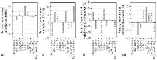 According to Figure 4, which presents the Yoon sensitivity model, Butcher C was the most important factor for predicting the MAB of beef minced meat, with a relative importance of 21.48%, while the influence of Butcher B exerted the most negative impact, with −44.32% negative importance. Weekdays (Wednesday) were the most important factor for predicting the LAB of beef minced meat, with a relative importance of 20.90%. while the influence of storage temperature showed the most negative impact, with −17.44% negative importance. Butcher C was the most important factor for predicting the number of E. coli in beef minced meat, with a relative importance of 19.08%, while the influence of Butcher B showed the most negative impact, with −26.62% negative importance. Butcher D was the most important factor for predicting the amount of S. aureus in beef minced meat, with a relative importance of 19.60%, while the influence of Butcher A showed the most negative impact, with −15.67% negative importance. Due to the obtained results of the relatively high influence of butcher shift on the microbiological quality of meat, it can be suggested that certain workers maintain much more hygiene in the working space than others, doing the work in accordance with good hygienic practice and in the shortest possible time. Accordingly, it would be recommended that a specific aspect of corrective action be taken in relation to these results. Although storage and meat temperature do not have a high relative influence on the number of MAB, these two variables have a great influence on other tested microorganisms. Consequently, it can be seen in Figure 4 that meat and storage temperature have different relative influences depending on LAB, E. coli, and S. aureus.