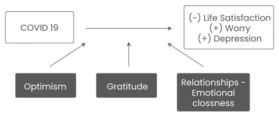 In line with the available evidence regarding the consequences of the pandemic on students’ well-being and mental health [,,,,], we found that the pandemic had negative consequences on student life, associated with their subjective well-being. The pandemic caused by COVID-19 affected students by reducing their life satisfaction and feelings of happiness, and by increasing depression and worry [,,,]. However, correlations between well-being variables were positive and positively correlated to gratitude, emotional closeness, and optimism. Similar to other studies conducted during the pandemic [,,], we found that being optimistic and grateful helped students reduce the negative effect of fear of infection and the pandemic’s impact on students’ academic performance, after adjusting for age and gender. Results showed that students who are more optimistic, closer to their parents and friends, and grateful can cope better with a crisis. Likewise, these positive attitudes and emotions increased well-being and reduced the prevalence of depression and worry.