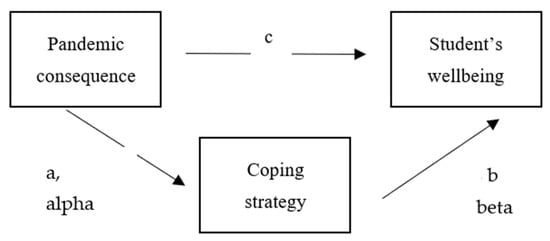 For analysis, we used a modifying Baron and Kenny’s [] approach to establish the mediation of each coping strategy on students’ wellbeing. Following Mehmetoglu [], the mediation effect was estimated following these steps. First, we fit a structural equation model (SEM) of coping strategy on students’ wellbeing by controlling for pandemic consequence to estimate simultaneously direct (c) and indirect paths (a alpha, b beta) (Figure 3). If either one path was not significant (or both were not significant) there was no mediation. Evidence of mediation was provided when both Pandemic Consequences → Coping Strategy and Coping Strategy → Wellbeing outcome coefficients were statistically significant. After that, Sobel’s z test was calculated to estimate the relative sizes of the indirect (mediated) vs. direct paths. The results of no, partial or complete mediation were determined as follows: (i) if the Sobel’s z test was significant and the direct path of Pandemic consequence → Wellbeing outcome was not, the mediation was full or complete; (ii) If both the z and the direct path of Pandemic consequence → Wellbeing outcome were significant, the mediation was partial; (iii) If the z was not significant but the direct path of Pandemic consequence → Wellbeing outcome was, the mediation was partial in the presence of a direct effect, (iv) If neither the z nor the direct path of Pandemic Consequence → Wellbeing outcome were significant, the mediation was partial in the absence of a direct effect. We also tested the coping strategy mediation hypothesis by using 634 Monte Carlo replications. Additional explanations of the testing mediation hypothesis can be found in Mehmetoglu [].