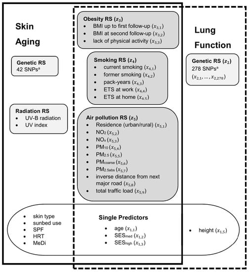 Here, data from the German SALIA cohort (Study on air pollution, lung function, inflammation and aging) is analyzed to prove the concept of applying risk scores to estimate relative contributions of environmental and genetic risk factors. The concept is applied to two aging traits, namely skin aging and aging-associated decreased lung function, to evaluate the relative contributions. The focus is on these two aging traits because for both it is well established that genetic and a number of specific exposomal factors contribute to their development [,]. Accordingly, important exposomal factors for lung aging are tobacco smoke and air pollution [,,]; for skin aging these include exposure to ultraviolet (UV) radiation, air pollution and tobacco smoke, as well as nutritional factors [].