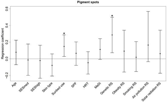 Regression coefficients (bootstrap medians and 95% percentile confidence intervals) of the predictors for pigment spots. The coefficients reflect the change in the z-score for one unit increase in the single predictors and one interquartile range increase in the risk scores. MeDi: Mediterranean diet; HRT: hormone replacement therapy; RS: risk score; SESmed: medium socio-economic status (reference: low socio-economic status); SEShigh: high socio-economic status (reference: low socio-economic status); SPF: sun protection factor; * p < 0.05.