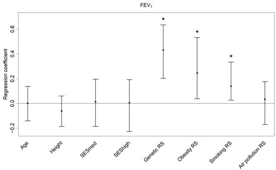 Regression coefficients (bootstrap median and 95% confidence interval) of the predictors for FEV1. The coefficients reflect the change in the z-score for one unit increase in the single predictors and one interquartile range increase in the risk scores. FEV1: forced expiratory volume in 1 s; RS: risk score; SESmed: medium socio-economic status (reference: low socio-economic status); SEShigh: high socio-economic status (reference: low socio-economic status); * p < 0.05.