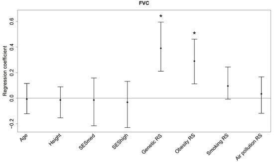 Regression coefficients (bootstrap median and 95% confidence interval) of the predictors for FVC. The coefficients reflect the change in the z-score for one unit increase in the single Predictors and one Interquartile Range Increase in the Risk Scores. FVC: forced vital capacity; RS: risk score; SESmed: medium socio-economic status (reference: low socio-economic status); SEShigh: high socio-economic status (reference: low socio-economic status); * p < 0.05.
