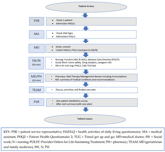 Once the patient arrived, the PSR checked them in. The medical assistant (MA) then took the patient’s vital signs and brought them to an exam room. The patients were also asked to complete a health activity of daily living questionnaire (HADLQ) and Patient Health Questionnaire 2 (PHQ-2) which are tools used to assess the patient’s functional ability and risk for depression, respectively [21,22]. The rates of completion were not collected or reported in this manuscript however, they are reported in the methods section since they were performed during the visit and meet the required components of the health risk assessment required by Medicare [23]. If the patient was not able to complete these on their own, the MA aided.