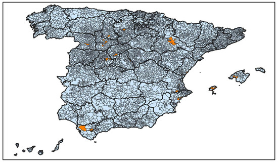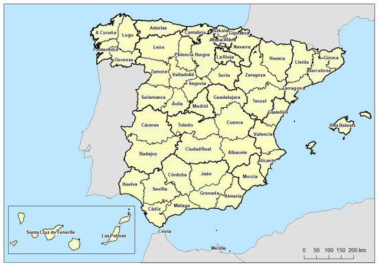 Spain is divided into 17 autonomous regions (further subdivided into 50 provinces and 2 autonomous cities, with the 8131 municipalities being the smallest administrative units) (Figure 1). According to the Atlas Estadístico de las Áreas Urbanas en España 2021 of the Ministry of Transport, Mobility and Urban Agenda (MITMA in Spanish), the population distribution is not homogeneous, since 69% of the Spanish population live in large urban areas with more than 50,000 inhabitants; in fact, 76% of the employment of the country is concentrated in these areas. Conversely, 86.7% municipalities are considered as non-urban, which represents 79.3% of the area of the country, although only 17.3% of Spanish inhabitants live there. According to this methodology, Spanish territory could be divided into three types of areas based on their relation with urban phenomenon, classifying the municipalities into large urban areas (which can be composed of one or more municipalities, and whose denomination is determined by the main city or cities), small urban areas (which are subdivided into 2 categories: municipalities of 20,000–50,000 or 5000–20,000 inhabitants, which do not belong to large urban areas) and non-urban [12].