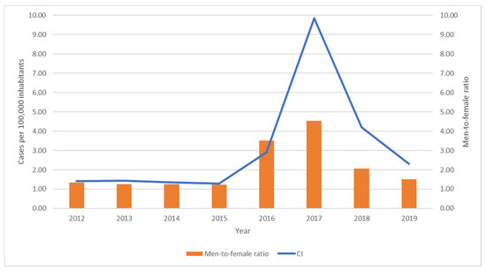 During the 2012–2018 period, 11,534 cases were notified. From 2012 to 2015, cumulative incidence remained stable around 1.37 cases per 100,000 inhabitants, rising later during 2016–2017 (reaching a maximum of 9.85 cases per 100,000 inhabitants in 2017), followed by a decrease in 2018 and 2019. A similar trend was observed regarding the male-to-female ratio, which achieved 3.51 and 4.53 in 2016 and 2017, respectively (Figure 3), the Pearson correlation being between this parameter and the cumulative incidence of 0.874.