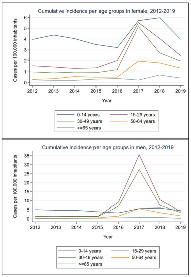 Temporal trends were also studied by sex and age groups. In women, an inversely proportional association was observed between cumulative incidence and age, with the 0–14 years-old group having the greatest one during the entire period, with 5.97 cases per 100,000 inhabitants in 2018. Nevertheless, in addition to the youngest population, a considerable increase of cases was observed in women aged 15–64 in 2017 and 2018. Regarding men, the inversely proportional association previously described was observed until 2015, with 3.92 cases per 100,000 inhabitants in the 0–14 years-old group that year. Since then, the cumulative incidence has risen drastically in individuals aged 15–29 and 30–49, which became the population with the highest number of cases from 2016 to 2018 (maximum of 35.58 and 26.27 cases per 100,000 inhabitants in 2017, respectively); in 2019, the 0–14 years-old group was again the most affected one. Cumulative incidence in the population older than 64 years in both men and women remained less than one case per 100,000 inhabitants during the entire period (Figure 4).