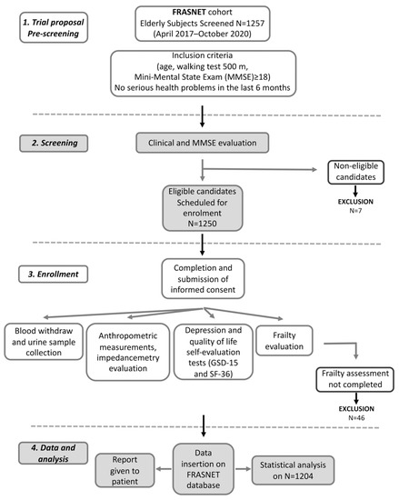 FRASNET is a cross-sectional observational cohort study on 1250 older adults. The inclusion criteria were (1) age equal or of more than 65 years; (2) walking capacity more than 500 m without assistance (self-reported) [21]; (3) Mini-Mental State Examination (MMSE) [22] with score ≥ 18; and (4) absence of recent and severe health problems resulting in a life expectancy of fewer than 6 months. The exclusion criteria were: subjects not able to sign informed consent, severe health problems (e.g., uncontrolled hypertension, recent upper or lower extremity fractures, myocardial infarction within the past 1 year). The volunteers filled out a questionnaire for demographic and psychosocial data. Current pathologies and therapies have been recorded as well as information about falls and access to the emergency room relating to the former year. Anthropometric measurements were also performed; urine and blood samples were collected. Moreover, some questionnaires were submitted such as for QoL (the Short Form 36 (SF-36) Health Survey) [23], depression (the Geriatric Depression Scale (GDS-15)) [24,25], MMSE [22] for the psychological evaluation, and also for physical activity (Physical Activity Scale for Elderly (PASE) [26], and exhaustion (the Fatigue Severity Scale (FSS)) [27] for frailty determination. A flow chart for subjects screening, enrolment, and data management is reported in Figure 1. The data were collected and reported in an electronic case report form (eCRF) created using FileMaker Pro v. 11.
