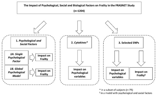 Despite this accumulating knowledge, it is still unclear how each of these factors relates to each other or what their relative role is in causing frailty. Effective prevention and treatment of the elderly patients require a multifaceted approach. A holistic understanding of the basis of frailty would allow more effective interventional personalized strategies that target socio-psycho-physiologic systems. In this study we focused on frailty determinants using a multidimensional approach that included anamnestic factors, psychological aspects, overall health and socio-economic status, together with immunological biomarkers and genetic variants.