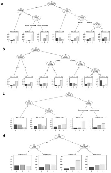 Binary tree computed by conditional recursive partitioning by psychological parameters. The terminal nodes showed the direct impact of these variables on frailty. (a) Effect of SF-36-PCS (the physical indicator of health-related quality of life), together with BMI classes, number of daily drugs (in quartile, “Drugs”), absence or presence of caregiver (NO/YES), annual income, and level of education (School), on frailty classes (0 = robust, 1 = pre-frail, 2 = frail subjects). The variables affecting frailty are SF-36-PCS, having or not having a caregiver, education level, and the number of daily drugs. (b) Effect of SF-36-MCS (the mental indicator of the quality of life), together with BMI classes, number of daily drugs (“Drugs”), absence or presence of caregiver (NO/YES), annual income, and level of education (School), on frailty classes (0 = robust, 1 = pre-frail, 2 = frail subjects). The variables affecting frailty are SF-36-MCS, level of education, and the number of daily drugs. (c) Effect of GDS-15 (0–5 = no depression, 6–9 = mild depression, 10–13 = depression), together with sex, age groups, BMI classes, number of daily drugs (“Drugs”), absence or presence of caregiver (NO/YES), annual income, absence or presence of leisure activities (NO/YES), and level of education (School), on frailty classes (0 = robust, 1 = pre-frail, 2 = frail subjects). The variables affecting frailty are GDS-15, level of education, and age groups. (d) Effect of MMSE, together with sex, age groups, BMI classes, number of daily drugs (“Drugs”), absence or presence of caregiver (NO/YES), annual income, and absence or presence of leisure activities (NO/YES), on frailty classes (0 = robust, 1 = pre-frail, 2 = frail subjects). The variables affecting frailty are the number of daily drugs and leisure activities.