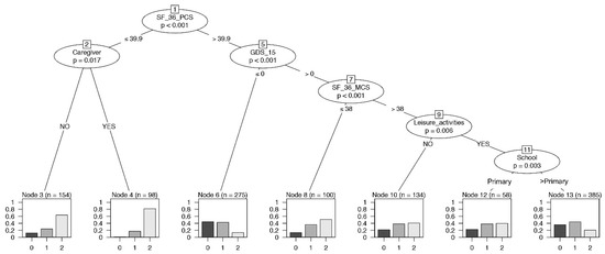 A conditional inference tree analysis for frailty was performed simultaneously including all the psychological variables as predictors. SF-36-PCS, caregiver, GDS-15, SF-36-MCS, leisure activities, and educational level significantly influenced the frailty (Figure 4). This model allowed us to focus on the important role of the variables SF-36-PCS, SF-36-MCS, and GDS-15 among the four psychological parameters. The conditional inference tree identified the highest proportion of robust individuals in the group with a higher performance of SF-36-PCS and no depression status (node 6). On the contrary, node 4 displayed the highest level of frail individuals with a lower SF-36-PCS level and the presence of a caregiver. In addition, a lower SF-36-MCS in the context of a depression status (>0) reported a high proportion of pre-frail and frail individuals (node 8).