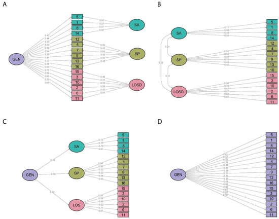 The Gratitude Resentment and Appreciation Test-Revised Short (GRAT-RS): factor analysis with weighted least squares means and variance adjusted (WLSMV) estimation. (A) bifactor model; (B) three-factor model; (C) higher-order model (D) unidimensional model (n = 537). GEN: general factor; LOSD: lack of a sense of deprivation specific factor; SP: simple pleasures specific factor; SA: social appreciation specific factor.