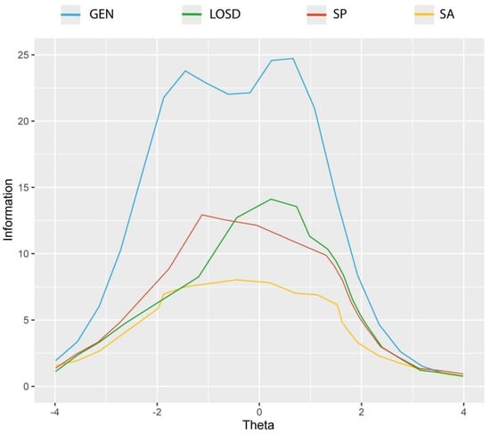 Figure 2 reports the test information functions for the general gratitude factor (GEN) and the three specific gratitude factors (i.e., LOSD, SP, and SA).