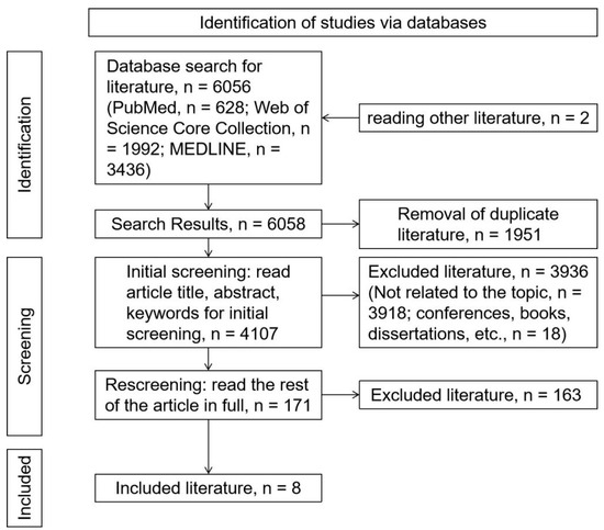 A total of 6056 articles were retrieved from the database according to the search strategy, and 2 articles were added by reading other articles’ references [8,43], bringing the total to 6058 articles. There were 1951 duplicate articles removed; 3918 documents unrelated to the topic were excluded; and 18 articles from conferences, books, dissertations, etc., were excluded, leaving 171 articles. After reading the full text of the remaining articles and rescreening, a total of 163 documents were excluded (non-original studies (reviews, book reviews, etc.) and non-English, n = 13; study population not young and middle-aged adults with hypertension, n = 35; unrelated to topic, n = 106; and study only reported current status of sedentary behavior, n = 9), and 8 documents were included [33,34,35,36,37,39,40,41]. The steps of the literature search are shown in Figure 1.