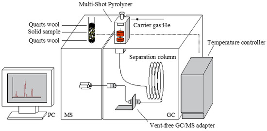 Reaction temperature and time are decisive factors affecting the distribution of biomass pyrolysis products. Cellulose pyrolysis can be divided into four regions: <300 °C; 300–370 °C; 370–450 °C; and >450 °C [7,25]. Therefore, the MC was pyrolyzed at 285 °C, 345 °C, 445 °C, 500 °C, 600 °C, and 700 °C, and the pyrolysis times were 1, 5, 10, and 20 s. All catalytic fast pyrolysis experiments were conducted for 10 s at 500 °C. Figure 1 shows the Py-GC/MS device used in the study. The pyrolysis process was conducted using a double-click pyrolysis device (EGA/PY-3030D; Frontier Lab, Fukushima, Japan). A 0.1± 0.01 mg sample was placed in a sample cup, and quartz cotton was placed on the upper and lower sides of the sample to prevent solid particles from spilling. The pyrolysis gas was analyzed by GC/MS (QP2010 Ultra; Shimadzu, Kyoto, Japan) with an inlet temperature of 250 °C. An Rtx-5MS capillary column (Restek, Bellefonte, PA, USA; length = 30 m, internal diameter = 0.25 mm, membrane thickness = 0.25 μm) was used for the chromatographic separation. The carrier gas was helium (99.999%) with a flow rate of 1.27 mL/min and split ratio of 100:1. The initial furnace temperature of the gas phase was set to 50 °C for 5 min, and the heating rate was then increased to 260 °C at 10 °C/min for 10 min. The interface temperature and ion source temperature of the GC/MS were set to 280 °C and 230 °C, respectively, and the mass spectrum range was 35–500 m/z. The chromatographic peak was determined by comparison with spectra in the NIST11 spectral library, the F-Search PY-1110E-181 spectral library, and previous data [19,26,27,28]. The chromatographic peak area of each compound in the Py-GC/MS pyrolysis products was proportional to its concentration. Therefore, changes in the yield of a product were determined by comparing the average peak area of each compound obtained under different reaction conditions. The percentage peak area indicates changes in the relative content of the detected products [29,30].
