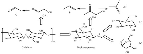 As the only carbon-based renewable energy that can be directly converted into liquid fuels, biomass energy has attracted wide attention. Fast pyrolysis is a thermochemical process in which biomass fuels undergo rapid pyrolysis and are condensed in the absence of oxygen. The process is also an economically feasible thermochemical method for transforming biomass into liquid products [1]. Bio-oils (acids, carbohydrates, aldehydes, ketones, hydrocarbons, esters, alcohols, and phenols, etc.) produced by fast pyrolysis can be widely used as fuels and valuable chemicals in many fields [2,3,4], and have gradually emerged as a clean energy that could partially replace traditional fossil fuels. As the most important component of lignocellulosic biomass, cellulose is mainly composed of carbon, hydrogen, and oxygen. Cellulose is a large linear homopolymer with a high degree of polymerization, in which the main component is monomeric glucose that can form fibrils of up to 15,000 glucose units. The internal glucose units in cellulose are connected by a β-1,4-glycosidic bond and have a strong fiber structure [5]. Cellulose is easy to obtain in nature and has a single structure. The structure and chemical characteristics of cellulose obtained from different forms of biomass under similar conditions have good repeatability [6]. To explore the pyrolysis process of biomass, researchers [7,8,9] have attempted to establish a pyrolysis mechanism suitable for biomass involving three components (cellulose, hemicellulose, and lignin), and mainly focused on the generation characteristics of biomass pyrolysis products. Due to the variety of biomass materials and complexity of the pyrolysis process, the pyrolysis mechanism of cellulose should be investigated based on product formation, to provide a reference for clarifying how high-value biomass pyrolysis products are distributed and utilized.