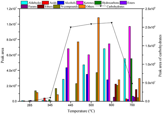 The yield and distribution of various compounds in cellulose pyrolysis bio-oil at different temperatures are shown in Figure 3 and Figure 4. Figure 3 shows that the pyrolysis of cellulose produced a variety of compounds, including aldehydes, acids, alcohols, ketones, carbohydrates, hydrocarbons, esters, furans, ethers, and N-compounds. According to the sum of the peak areas of the various compounds in Figure 3, the total peak areas of each temperature between 285 °C and 700 °C were 3.41 × 106, 1.34 × 107, 2.24 × 108, 2.38 × 108, 2.37 × 108, and 7.55 × 107, respectively. At the pyrolysis temperature of 500–600 °C the yield of volatile liquid was substantially improved, and the yield of many compounds changed significantly with the change of pyrolysis temperature, indicating that the reaction temperature significantly affected the type and yield of compounds produced by cellulose pyrolysis.