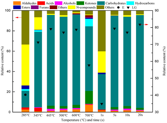 Figure 3 shows that the aldehyde yield gradually increased as the temperature increased from 285 °C to 600 °C, and then began to decrease as the temperature increased from 600 °C to 700 °C. There was no obvious pattern to the formation of acid compounds in the experimental temperature range; the highest yield occurred at 345 °C and there was no production between 445 °C and 600 °C. Alcohols were not produced at the lowest temperature (285 °C), and their formation displayed a trend of first increasing and then decreasing between 345 °C and 700 °C; the yield reached a maximum at 445 °C. Ketones were not produced at low temperatures (285–345 °C), and the highest production was achieved at 700 °C. Below 600 °C, the carbohydrate yield increased monotonically with the increase in temperature. When the temperature was >600 °C, the carbohydrate yield decreased sharply with the increasing temperature. Figure 4 shows the distribution of various compounds in bio-oil from MC pyrolysis at different temperatures and times. At 345 °C, 445 °C, 500 °C, 600 °C, and 700 °C, the carbohydrates were the most important pyrolysis products, with relative contents of 74.27%, 89.41%, 87.95%, 88.99%, and 63.60%, respectively. The LG content was highest at 345 °C, 445 °C, 500 °C, 600 °C, and 700 °C, accounting for 71.22%, 79.13%, 77.06%, 78.74%, and 57.69% of the total products, respectively. Hydrocarbons were generated only at lower temperatures (285–345 °C) and at the highest temperature (700 °C), with the highest yield achieved at 700 °C. A small amount of the hydrocarbons produced at low temperatures were alkanes with multiple carbon atoms, while at high temperatures they were mostly olefins and aromatic hydrocarbons with simple structures. This shows that higher temperatures resulted in more complete cellulose decomposition, and the product type was simpler. In the experimental range, the ester yield first decreased and then increased with the increase in temperature, and reached a maximum at 700 °C. Furans and ethers were generated only at 600–700 °C, and their highest yields occurred at 600 °C and 700 °C, respectively. As the temperature increased from 285 °C to 500 °C, the yield of N-compounds increased gradually, and then began to decrease as the temperature increased from 500 °C to 700 °C. N-compounds were the most important pyrolysis products at 285 °C, with a content of 40.29%. At 285 °C, E was the most abundant compound, accounting for 40.29% of the pyrolysis products (Figure 4).