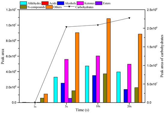 The content and yield distribution of various compounds in the pyrolysis bio-oil when MC was pyrolyzed for different times at 500 °C are shown in Figure 4 and Figure 5. According to the sum of the peak areas of various compounds shown in Figure 5, it can be concluded that the total peak areas at pyrolysis times of 1, 5, 10, and 20 s were 2.79 × 106, 2.26 × 108, 2.38 × 108, and 2.49 × 108, respectively. It can be seen that the pyrolysis time of 20 s improved the yield of volatile liquid. As shown in Figure 5, the yield of all compounds significantly increased with pyrolysis time from 1 to 5 s, while the yield of all compounds changed little between 5 and 20 s. As the pyrolysis time increased from 1 to 10 s, the yields of aldehydes, alcohols, ketones, and N-compounds displayed an increasing trend. As the pyrolysis time continued to increase from 10 to 20 s, the yields of these compounds began to decrease. Acids were only produced in trace amounts at a pyrolysis time of 1 s, and esters were only produced during a short pyrolysis time (1–5 s), with the highest yield occurring at 5 s. The yield of carbohydrates increased with the increasing pyrolysis time, and reached a maximum at 20 s. Carbohydrates were the main product of cellulose pyrolysis from 1 to 20 s, with relative contents of 34.93%, 89.84%, 87.95%, and 91.34% for 1, 5, 10, and 20 s, respectively. The compound with the highest relative content after pyrolysis of 1–20 s was LG, accounting for 34.93%, 79.35%, 77.06%, and 81.75 of all products at 1, 5, 10, and 20 s, respectively (Figure 4).