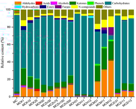 The addition of ZrO2 had a promotional effect on the pyrolysis of MC, which produced aldehydes; their relative content increased from 2.00% (MC) to 3.26% (MCZr31), 6.60% (MCZr11), and 5.91% (MCZr13) (Figure 6). However, it had no effect on the production of acids or furans from MC, and the yields of these two compounds were always 0%. Using ZrO2 as a catalyst slightly inhibited the formation of alcohols, and the inhibitory effect had no clear relationship with the amount of catalyst added. The ketone content increased in the presence of ZrO2, and with the increase in the amount of catalyst added. Phenols were produced only when the amount of ZrO2 added was high (MCZr13), but the relative content was only 0.31%. Using ZrO2 as a catalyst promoted an increase in the contents of hydrocarbons, esters, and N-compounds, but changes in the catalyst content had little effect on the production of these three compounds. The presence of ZrO2 also significantly inhibited the production of carbohydrates, with their relative content decreasing from 87.95% (MC) to 83.58% (MCZr31), 71.66% (MCZr11), and 74.46% (MCZr13) (Figure 6). The decrease in carbohydrate content was mainly due to the decrease in LG content, from 77.06% to 73.59% (MCZr31), 63.31% (MCZr11), and 65.78% (MCZr13) (Figure 7).