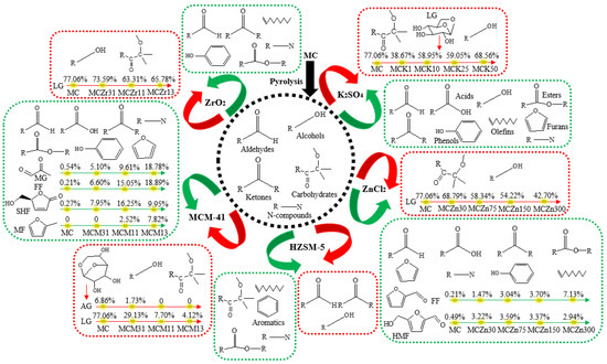 Five different catalysts, K2SO4, ZnCl2, HZSM-5, MCM-41, and ZrO2 were used to conduct the catalytic fast pyrolysis of MC; the results are shown in Figure 6 and Figure 7. As shown in Figure 6, introducing K2SO4 into MC significantly increased the aldehyde content from 2.00% (MC) to 10.98% (MCK1), 9.33% (MCK10), 6.65% (MCK25), and 5.21% (MCK50), and the ketone content from 2.54% (MC) to 19.55% (MCK1), 12.51% (MCK10), 11.09% (MCK25), and 8.75% (MCK50). The potassium ion significantly promoted these two kinds of compounds when the amount of catalyst was low, and the promotional effect decreased with the increase in catalyst content. The increase in contents of these two compounds was not reflected in the increase in content of one or more compounds, but the introduction of K+ increased the number of different types of these two compounds, thereby improving their relative contents. The five catalysts had no obvious effect on the acid production of MC, and the acid content reached a maximum of only 2.32% at MCK25. In the presence of K2SO4, small amounts of catalyst (MCK1) slightly promoted the formation of alcohols, while large amounts of catalysts (MCK10, MCK25, and MCK50) inhibited the production of alcohols until the content was 0%. Small amounts of K2SO4 (MCK1, MCK10, and MCK25) promoted the production of some phenolic compounds, while hydrocarbons (olefins) were produced only in trace amounts with the addition of MCK50. Similar to the aldehydes and ketones, K+ had a promotional effect on esters and N-compounds when small amounts were added, but this effect decreased with increasing catalyst content. Large amounts of catalysts (MCK10, MCK25, and MCK50) had a small promotional effect on furan formation. Using K2SO4 as a catalyst, the carbohydrate yield was significantly reduced, and its content decreased from 87.95% to 43.76% (MCK1), 61.49% (MCK10), 68.98% (MCK25), and 78.05% (MCK50). The inhibitory effect on carbohydrates also decreased with increasing catalyst content. The decrease in production of carbohydrates was mainly reflected in the decrease in LG content, from 77.06% to 38.67% (MCK1), 58.95% (MCK10), 59.05% (MCK25), and 68.56% (MCK50) (Figure 7). In summary, the addition of K2SO4 had opposing effects on the formation of compounds. This may be because K+ and SO42 have opposite effects on the distribution and composition of pyrolysis products. For example, some studies have reported that the presence of K+ reduces the formation of LG, while the introduction of SO42 can improve the selectivity of LG and increase its production [1,33]. In addition, in all catalytic experiments the highest contents of alcohols (1.97%) and esters (4.52%) were obtained using MCK1.