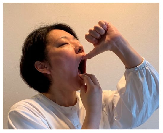 In the JE w/pain group, as jaw exercises, participants were instructed to manually open their mouths at home according to the following protocol (Figure 1) [15,16]. Three fingers of the dominant hand, excluding the thumb and little finger, were to be placed on the incisal edges of the mandibular incisors, and the thumb of the opposite hand was to be placed on the incisal edges of the maxillary incisors. Participants were to open their mouths with their hands and keep them open when they started to perceive pain in the TMJs and/or masticatory muscles (masseter and/or temporalis). The open position was to be maintained for 10 s. Participants performed this stretching five times as a single set after each meal and before bedtime; a total of four sets were performed each day for eight weeks.