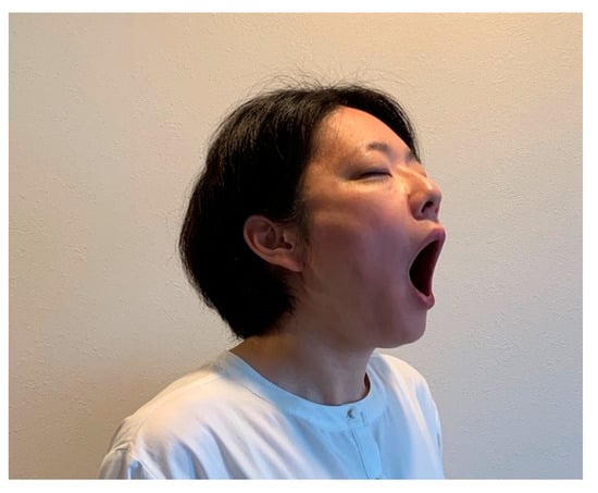 In the JE w/o pain group, participants were instructed to perform the jaw-opening exercise without using their hands, by themselves at home, according to the following protocol (Figure 2). Participants were to open their mouths as wide as possible without any pain in their masticatory muscles (masseter and/or temporalis) or TMJs. The open position was to be maintained for 10 s. The participants performed this stretching five times as a single set, after each meal and before bedtime; a total of four sets were performed each day for eight weeks.