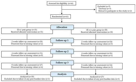 Sixty-six patients with TMDs were recruited. Five patients who did not meet the inclusion criteria for this study were excluded (three were too busy to visit the hospital and two refused to participate in the study). Thus, 61 patients (49 women and 12 men, from 18–90 years old, with a mean age of 50.1) were enrolled in the study. These patients were assigned to two groups: 31 in the in the JE w/pain group and 30 participants in the JE w/o pain group. Figure 3 shows the flow diagram of the trial and participant assessment. A total of 57 participants (46 women and 11 men, from 18–90 years old, with a mean age of 51.4 years) were finally included in the analysis after four dropped out. In the JE w/pain group, one participant dropped out because of a refusal to visit due to fear of the coronavirus disease (COVID-19). In the JE w/o pain group, three participants dropped out (one because of a refusal to visit due to fear of COVID-19, one contracted COVID-19, and the third due to difficulty attending the clinic due to a job search).