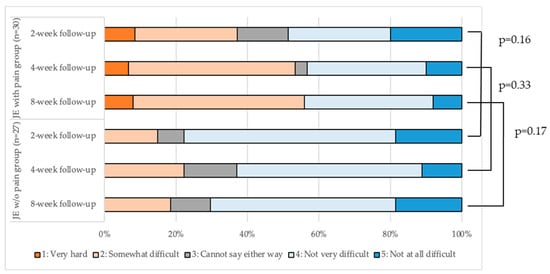 Figure 4 is a band graph showing the percentage of the responses to the question, ‘How difficult was it for you to do the jaw-opening exercise?’. There was no significant difference between the two groups in the percentage of the responses to the question on the difficulty of the jaw-opening exercise at any evaluation (p > 0.05). In the JE w/o pain group, no participant reported the jaw-opening exercise as ‘Very difficult’ from T1 to T3, whereas in the JE w/pain group, 10%, 6.7%, and 6.7% of participants reported that the jaw-opening exercise was ‘Very difficult’ at T1, T2, and T3, respectively. The percentage of participants who reported that the jaw-opening exercise was ‘Somewhat difficult’ was 14.8%, 22.2%, and 18.5%, and 33.3%, 46.7%, and 40.0% at T1, T2, and T3 in the JE w/o pain and JE w/pain groups, respectively.