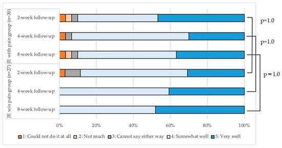 The proportion of participants’ responses regarding the implementation of the exercise at each follow-up is shown in Figure 5. There was no significant difference in the response distributions between the two groups at any follow-up (p > 0.05). ‘Somewhat well’ or ‘Very well’ represented >90% of the total responses to the question ‘How well did you perform the jaw-opening exercise?’ in both groups. In addition, only 3.3% of the participants in the JE w/pain group reported ‘Could not do it at all’ from T1 to T3. In the JE w/o pain group, 3.7% of participants reported that they “Could not do it at all” at T1, but not at T2 and T3.