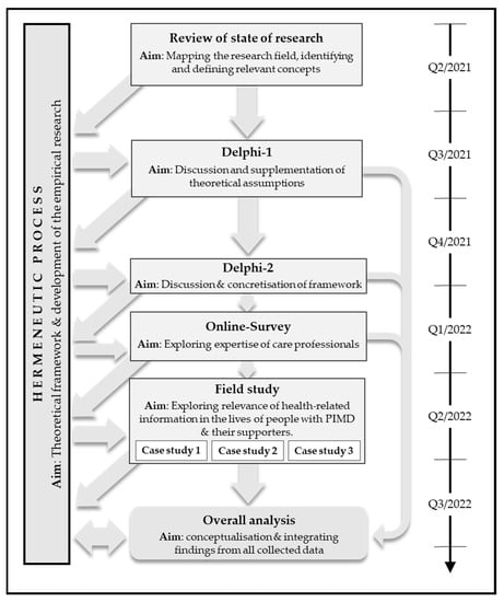 The field study focused on the exploration of the importance of health-related information in the everyday lives of people with PIMD and their supporters. Therefore, we pursued a multi-perspective approach, following the principles of participation-oriented research [33,34], which aims to maximise participation for those people who are unable to communicate their perspectives and needs without support. Following the guiding principle of this approach, we conducted a research design that allowed us to obtain the individual experiences and needs regarding health-related information and its communication from the participating individuals themselves. The concomitant challenges (little or no verbal language, high level of support, presumably limited cognitive-reflexive skills) were addressed with a multimethod design based on the Mosaic Approach [35]. We developed individualised survey methods and instruments that included elements of Photo Voice [36], participant observation [37], but also innovative approaches, which are outlined below (2.3.1). Furthermore, the aspect of informed or ongoing consent is and was of overarching importance in this participatory approach (2.3.2.) which entails continuous (ethical) reflection on the part of the researchers (2.3.3).