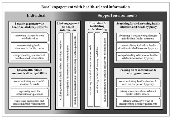 In this section, we present two categories of our overall analysis, under which we have collected all evidence dealing with the basic health-related capabilities of people with PIMD. First, we will look at how people with PIMD engage with health-related information and requirements (3.1.1). Then we will focus on the basal communication capabilities that are important when engaging with health-related information (3.1.2).