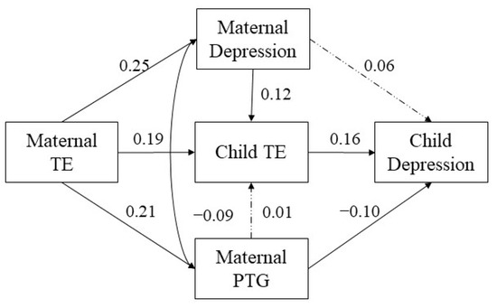 First, a direct effects model was constructed and indicated a direct association between maternal TE and children’s depressive symptoms. Path analyses revealed that maternal TE did not have a significant direct relation with children’s depressive symptoms (β = −0.04, p = 0.401).