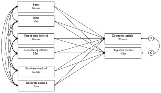 An Actor–Partner Interdependence Model (APIM) is a statistical method that tests interdependence in a relationship. The two major effects within APIMs are actor effects and partner effects. The actor effect is intrapersonal and is the effect of an individual’s independent variable on their own dependent variable. The partner effect is interpersonal and is the effect of a partner’s independent variable on an individual’s dependent variable. Six different actor–partner interdependence models [31] were examined, with stress, fear of being infected, and emotional overload as the independent variables in each model and the dependent variables being amusement, parent-oriented anxiety, parent-oriented frustration, child-oriented sympathy, child-oriented empathy, and parental responsiveness (see Figure 1). The APIMs were tested using the Lavaan 0.6–7 package [32] for R 4.0.3 [33] with the Robust Maximum Likelihood (MLR) estimator. All tests were two-tailed, and the significance level was set to α = 0.05. SPSS 27.0 (IBM, Armonk, NY, USA) was used to calculate the means, standard deviations, and Pearson correlation coefficients.