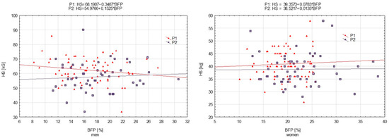 The relationship in the case of HS was greater in the men’s group assessed during P1, whilst in the rest of the groups, associations were weak (Figure 1), as confirmed by the horizontal lines. The constants of the regression functions (included in the scatterplots) were different (in men and women), which confirmed statistically significant coefficients calculated from multivariate analysis (Table 5). However, statistically not significant interactions suggested that one-unit changes in predictors were associated with similar mean changes in response, as in P1 and P2 for both men and women.