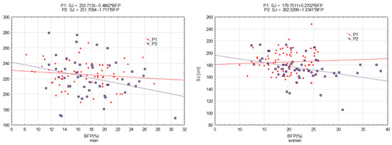 There was a significant shift in SJ, but only in women (Figure 3 and Table 5). In addition, there were significant differences in slopes. In the scatterplot, it appears that a one-unit increase in BFP was associated with a significantly greater decrease in SJ during P1 compared to during P2 (Table 5).