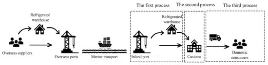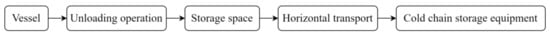 - The logistics process in port. As shown in Figure 2, the cargo is first unloaded from the ship to the front yard storage space through the port unloading operation, to be transferred between the water area and the land area. Then, horizontal transportation is carried out through the vehicles in the port, and the cold chain cargo is transported to the cold chain warehouse and the inspection equipment, which will be released after customs clearance. The safety and standardization of cold chain operation in port directly determine the stability of cold chain cargo in the port’s external environment and the efficiency of operations production, thus affecting the quality of cold chain cargo and cold chain logistics costs.